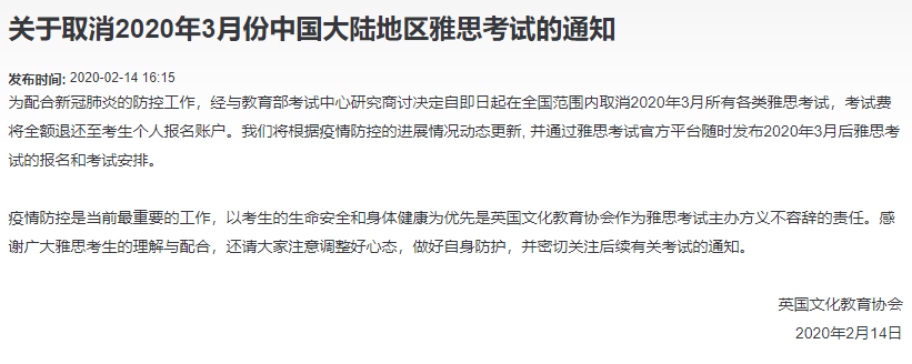 而在三天前,英國文化教育協(xié)會也******時間宣布取消所有3月份雅思考試安排。