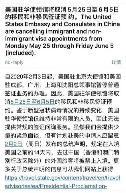 之前公布的信息是,面簽預約取消持續(xù)到5月22日;而如今,根據(jù)美國駐華使領館發(fā)送的最新郵件通知顯示:其將取消5月最后一周和6月******周的移民和非移民簽證預約。其郵件中表示,“鑒于新型冠狀病毒情況的持續(xù)變化,美國駐華使領館僅維持非常有限的人員,因此無法提供常規(guī)的簽證問詢服務。”