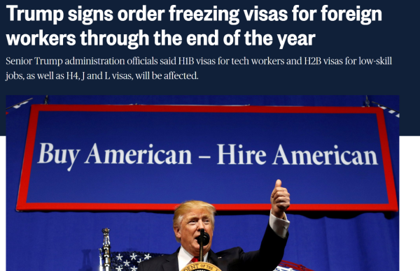 去年,川普凍結(jié)了為外國(guó)工人提供的新簽證,理由是新冠大流行造成的經(jīng)濟(jì)衰退期間,有必要保留工作,并且發(fā)布了公告,阻止他們?nèi)刖趁绹?guó)。