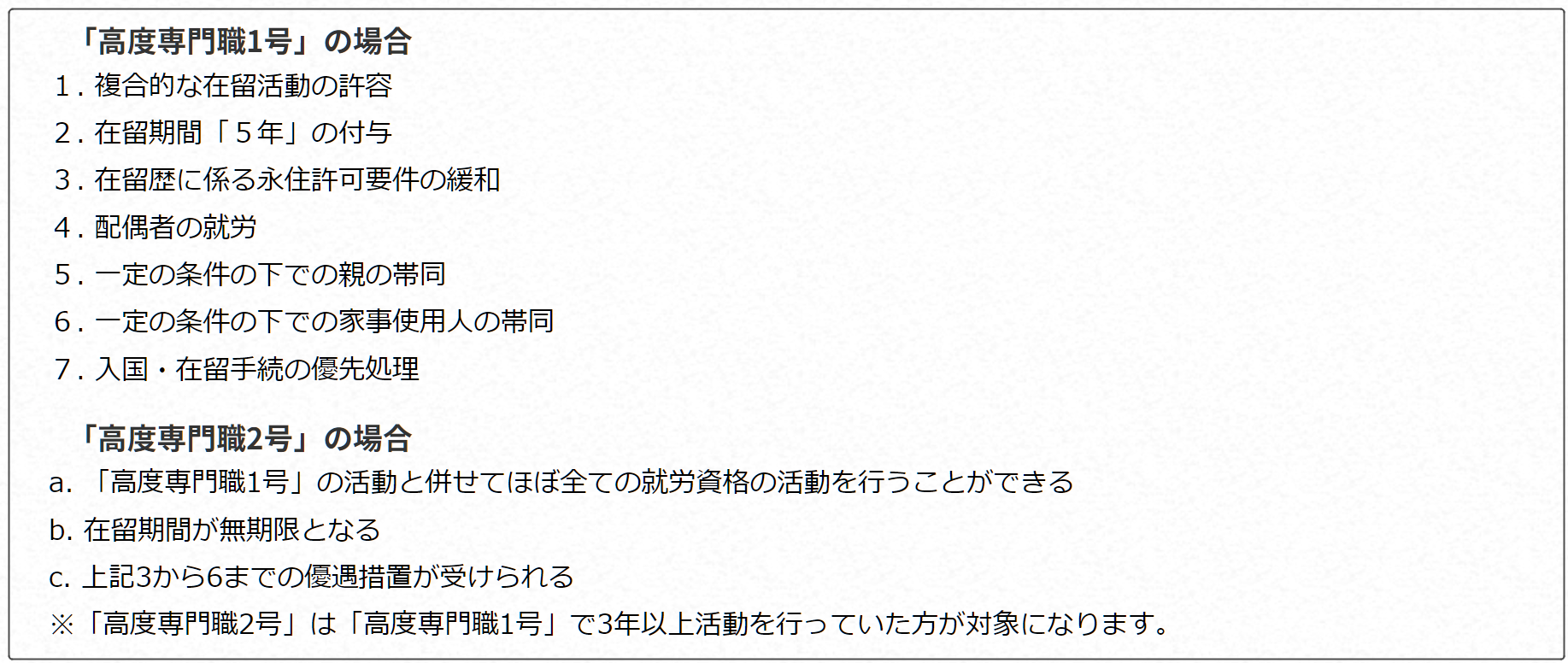之前所實(shí)施的高度人才制度對學(xué)歷、工作經(jīng)歷、年收入等項(xiàng)目進(jìn)行打分,超過一定分?jǐn)?shù)將給予在留5年的“高度專門職1號”資格,經(jīng)過3年后可轉(zhuǎn)為無在留期限的2號資格。