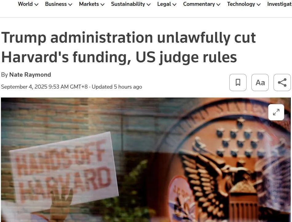 當(dāng)?shù)貢r(shí)間9月3日,美國(guó)波士頓聯(lián)邦地區(qū)法院法官艾莉森 · 伯勒斯(Allison Burroughs)依法裁定,特朗普政府在今年4月凍結(jié)哈佛大學(xué)逾20億美元聯(lián)邦研究經(jīng)費(fèi)的行為屬于非法報(bào)復(fù)