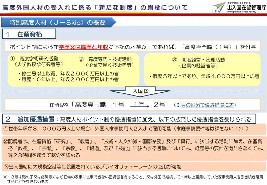 2023年4月14日,日本出入國在留管理廳發(fā)布公告,從4月21日起面向外國人新增設(shè)的“特別高度人才制度”正式開始實(shí)施,此制度針對擁有碩士學(xué)位及以上的高薪外國人才,或高收入企業(yè)主設(shè)立。